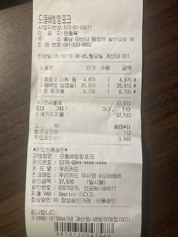 2025-11-07 08:30:08 올린 판독 ORC 품목명 수량 단가 금액 드뜸참포크(M) 등 1 4,870원 4,870원 드뜸배방 삼겹살[ 1 25,910원 25,910원 한돈 찌개용 1 6,730원 6,730원 합계 37,510 원 품목 분류 결과 품목명 대분류 중분류 소분류 제품분류