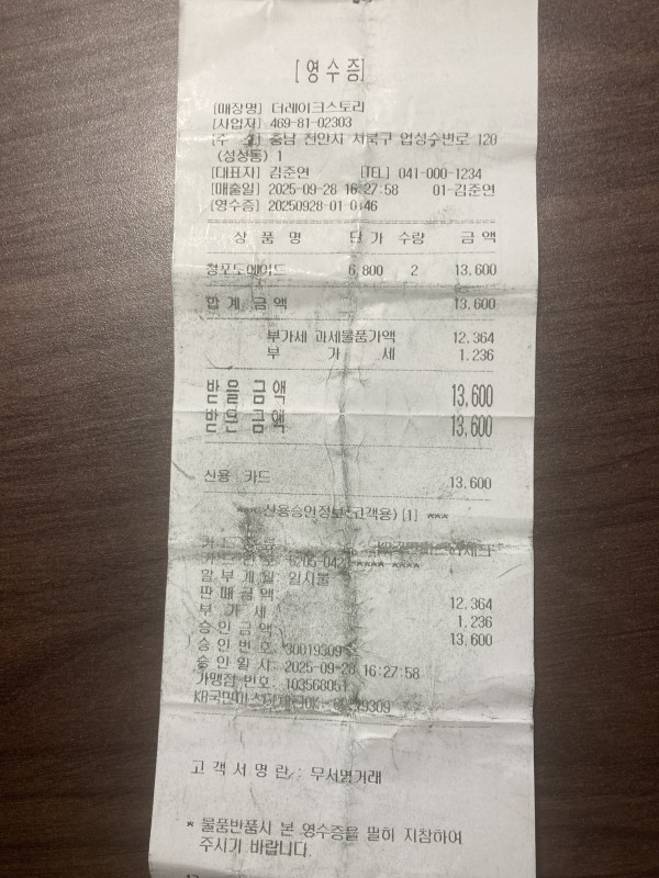 2025-12-24 11:06:55 올린 판독 OCR 품목명 수량 단가 금액 청포도에이드 2 6,800원 13,600원 합계 13,600 원 품목 분류 결과 품목명 대분류 중분류 소분류 제품분류 청포도에이드 음식료품 식료품 육류 기타육류 선택 농림수산물 음식료품 의류 및 잡화 가전제품 및 전기장비 일반 생활용품 가구 의약 및 화학제품 석탄 및 석유제품 운송장비 미분류 식료품 육류 기타육류