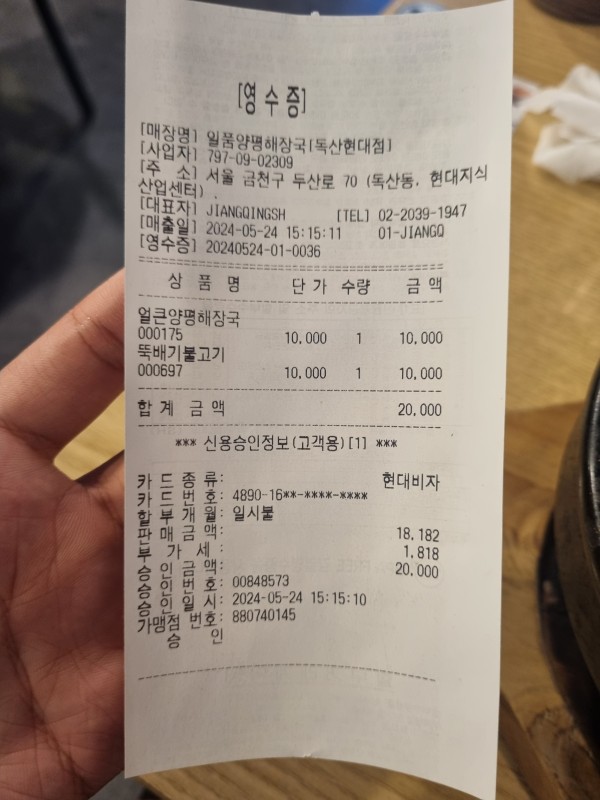 2025-12-09 14:15:11 올린 판독 OCR 품목명 수량 단가 금액 얼큰양평해장국 1 10,000원 10,000원 뚝배기불고기 1 10,000원 10,000원 합계 20,000 원 품목 분류하기
