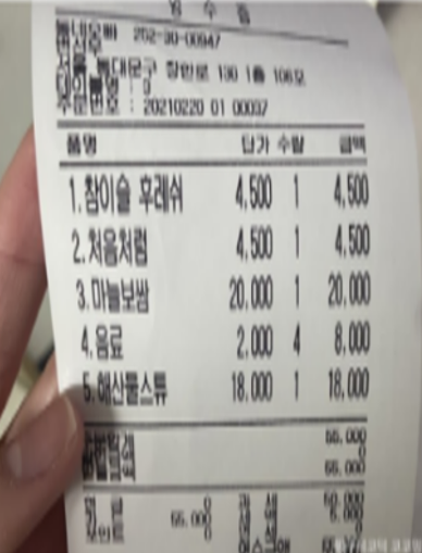2025-12-09 17:09:19 올린 판독 OCR 품목명 수량 단가 금액 1. 참이슬 후레쉬 1 4,500원 4,500원 2. 처음처럼 1 4,500원 4,500원 3. 마늘보쌈 1 20,000원 20,000원 5.해산물스류 1 18,000원 18,000원 4. 음료 2,000원 8,000원 합계 55,000 원 품목 분류하기