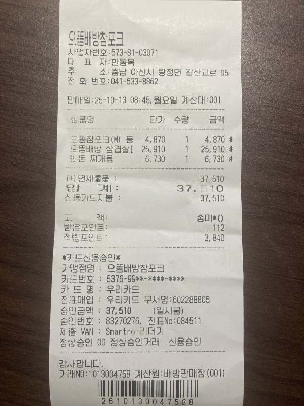 2025-12-08 16:11:48 올린 판독 OCR 품목명 수량 단가 금액 드뜸참포크(M) 등 1 4,870원 4,870원 드뜸배방 삼겹살[ 1 25,910원 25,910원 한돈 찌개용 1 6,730원 6,730원 합계 37,510 원 품목 분류하기
